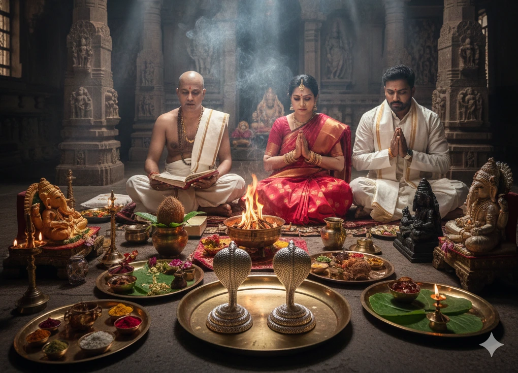 The Kalsarp Puja Vidhi includes Ganesh Puja, Kalash Sthapana, Rahu-Ketu Shanti, Nag Puja, mantra chanting, and aarti. The rituals are completed in a single day following strict Vedic procedures.